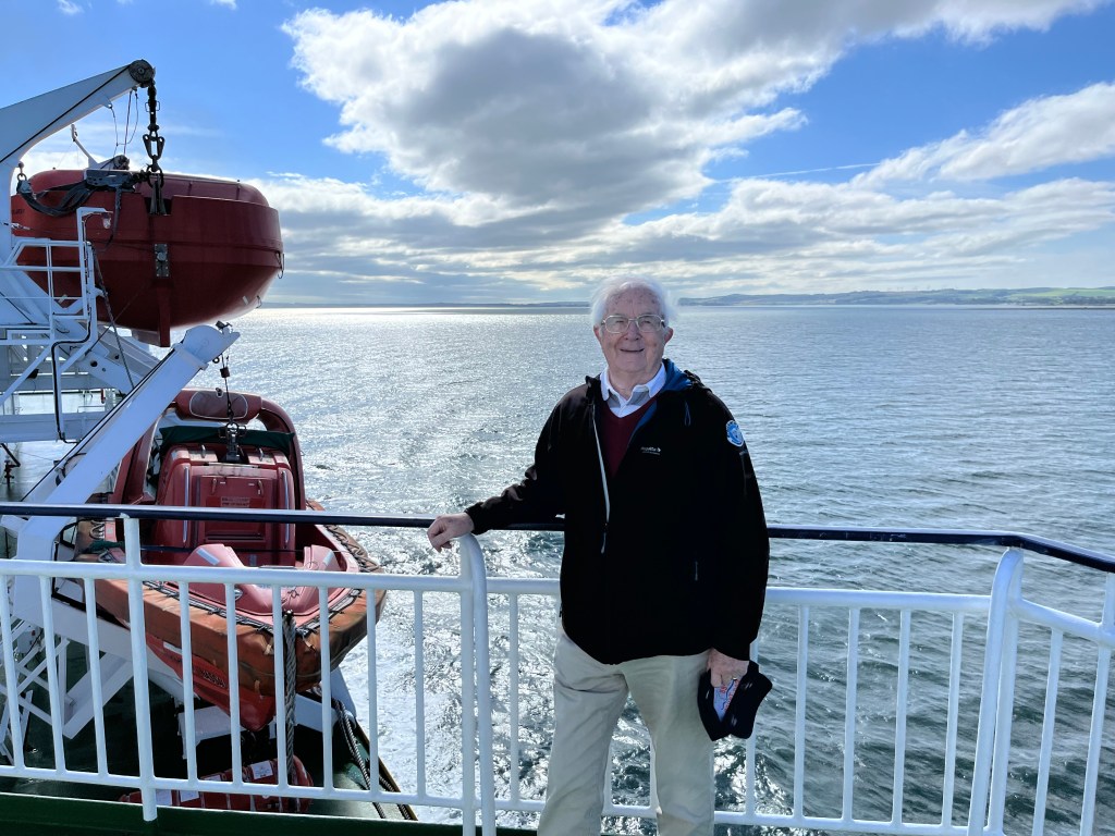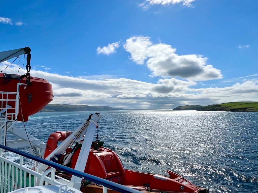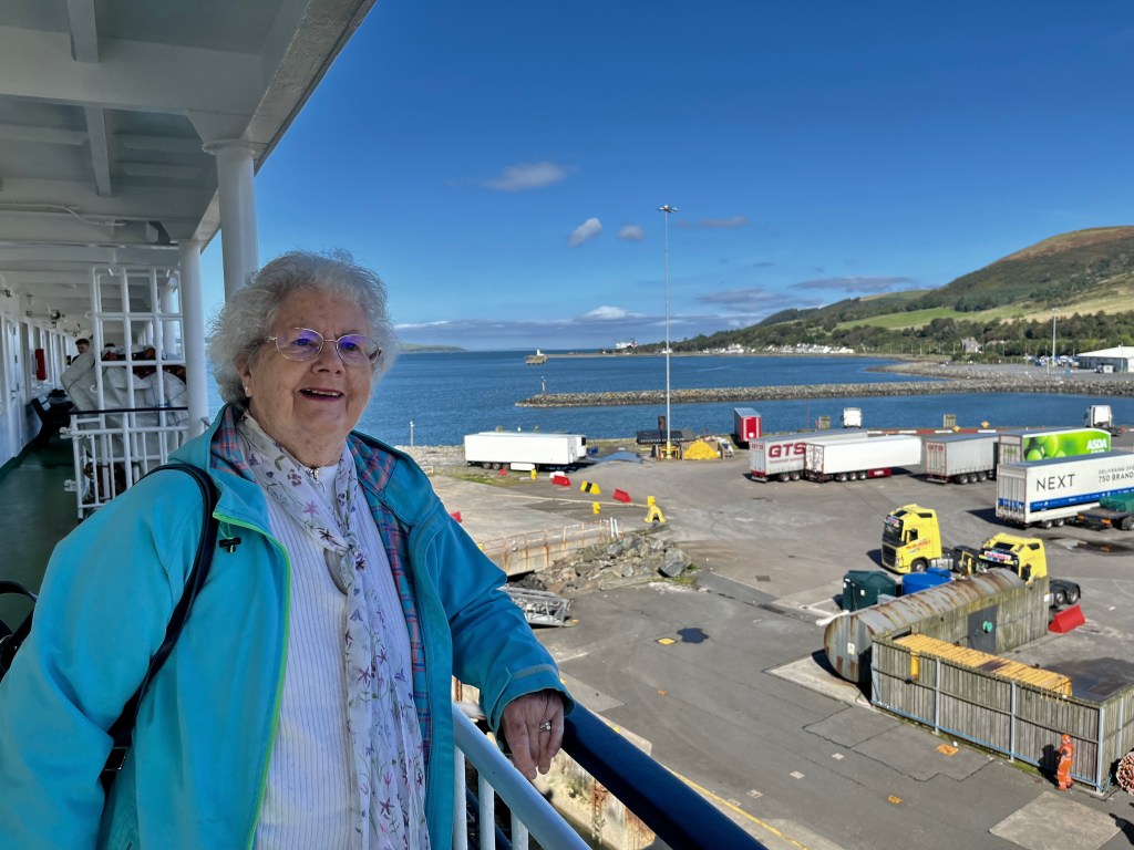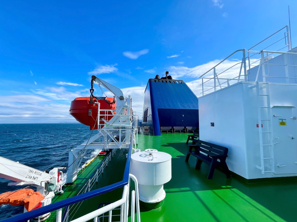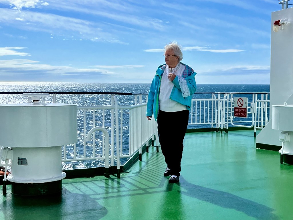 Muriel on the ‘European Highlander’Most of the two hour crossing spent on the Viewing DeckBasking in the sunshine.Blue sky all the way.