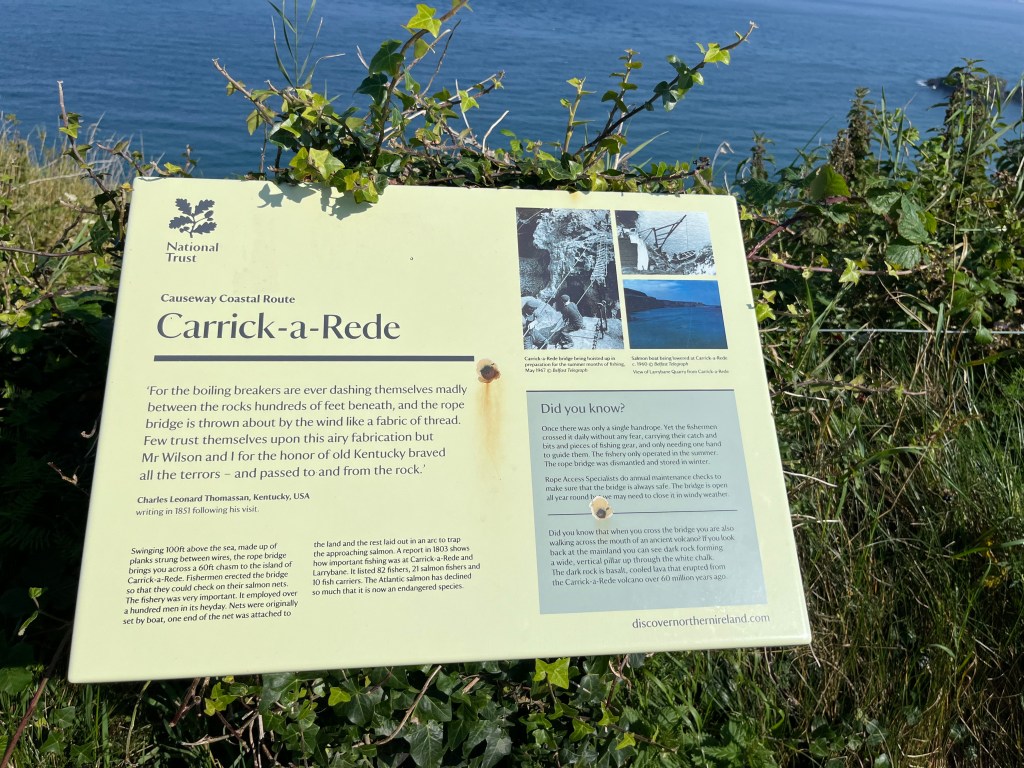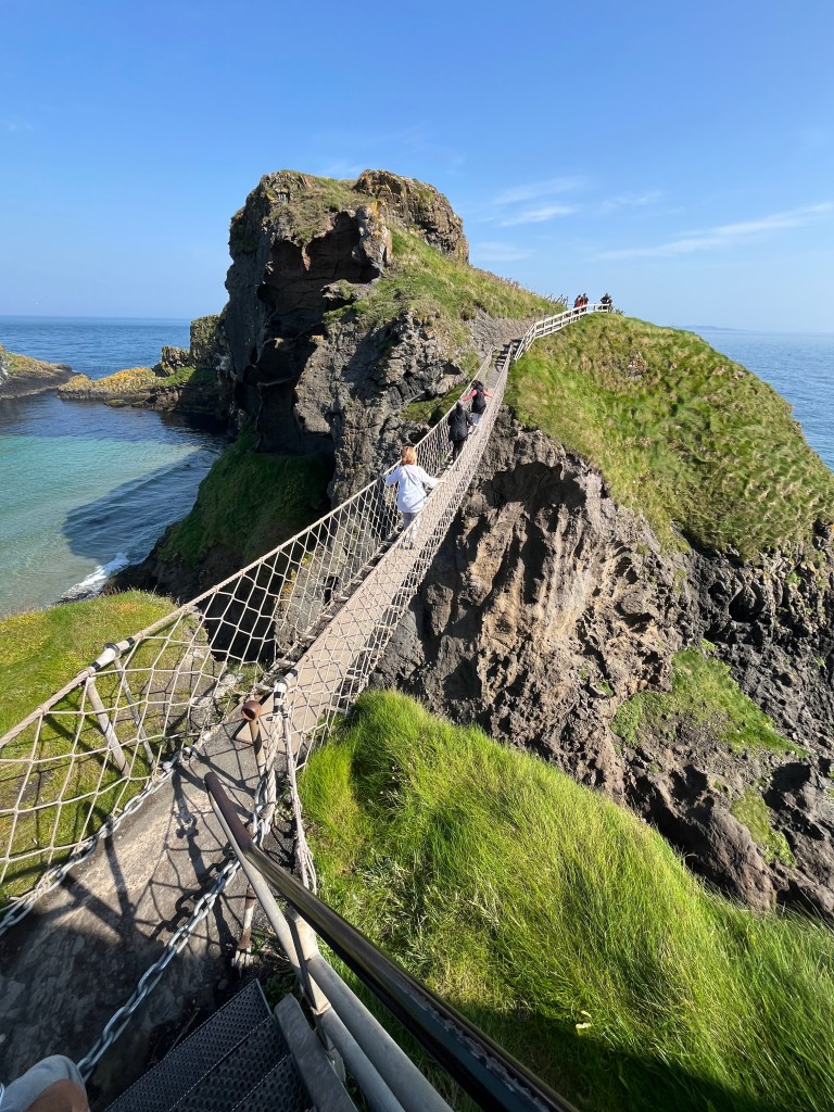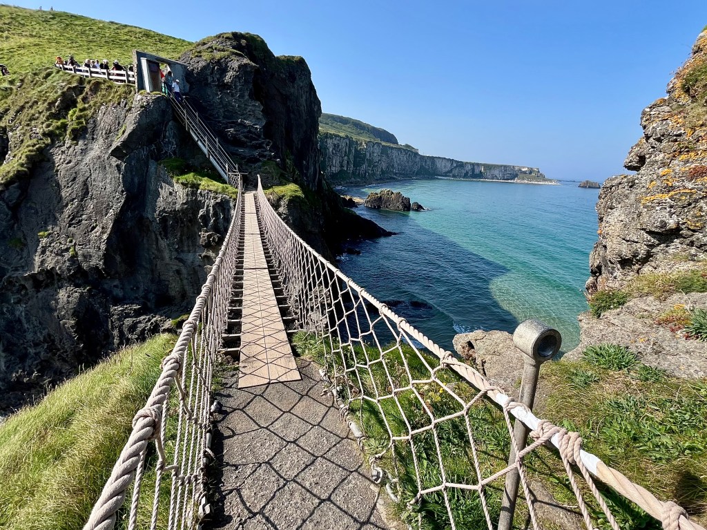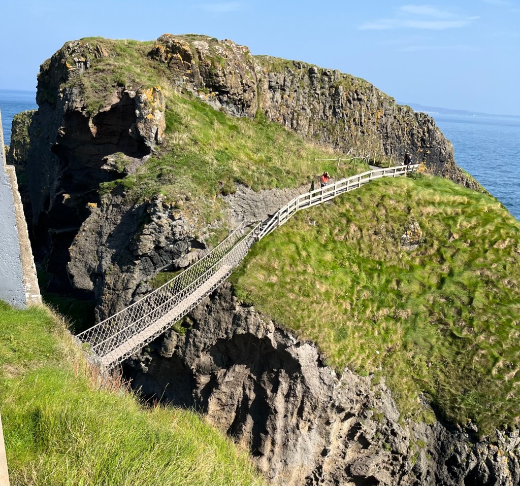 In the morning, after a very comfortable night’s sleep and a refreshing breakfast we were ready for one of the world’s great road journeys around the Antrim Coast, with its magnificent views of land and sea, and beautiful quaint villages! Robert (Helen’s husband) was our experienced driver and guide and we had two particular places in mind – Carrick-a-Rede and its spectacular rope bridge, and the famous ‘Giant’s Causeway’ with its large Museum and Visitors’ Centre, and its fascinating rock formations. (See earlier blog re visit to Fingals’ Cave for a similar phenomenon).