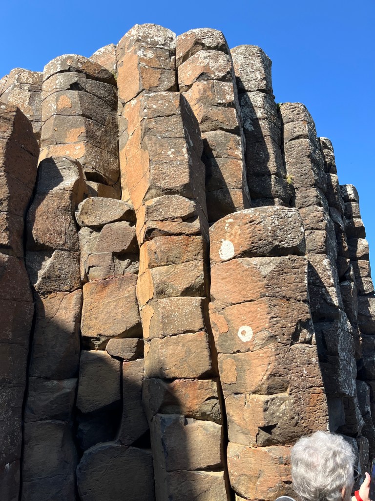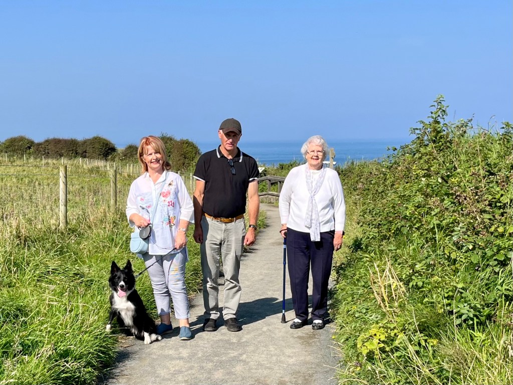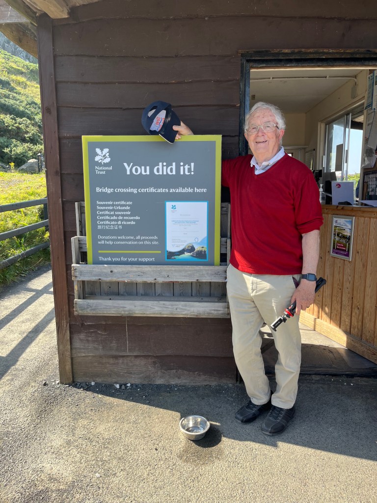 >>>>>Helen, Robert and Muriel with sheepdog ‘Belle at Carrick-a-Rede.Carrick-a-Rede Rope BridgeNot for the faint-hearted.Looking pleased with myself.Not too strong a breeze for the crossing, as you looked down on the rocks and waves below.< Ballintoy >Balintoy’s ChurchThe amazing hexagonal rock formations.< The Giant’s Causeway. >Time for a rock climb.Enjoying the view at the Giant’s CausewayNow for a ‘paddle’ ‘at PortrushMuriel and that Giant!Dunluce Castle