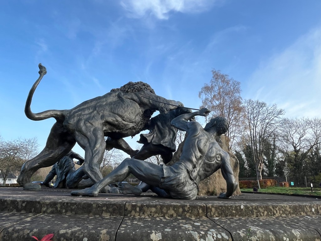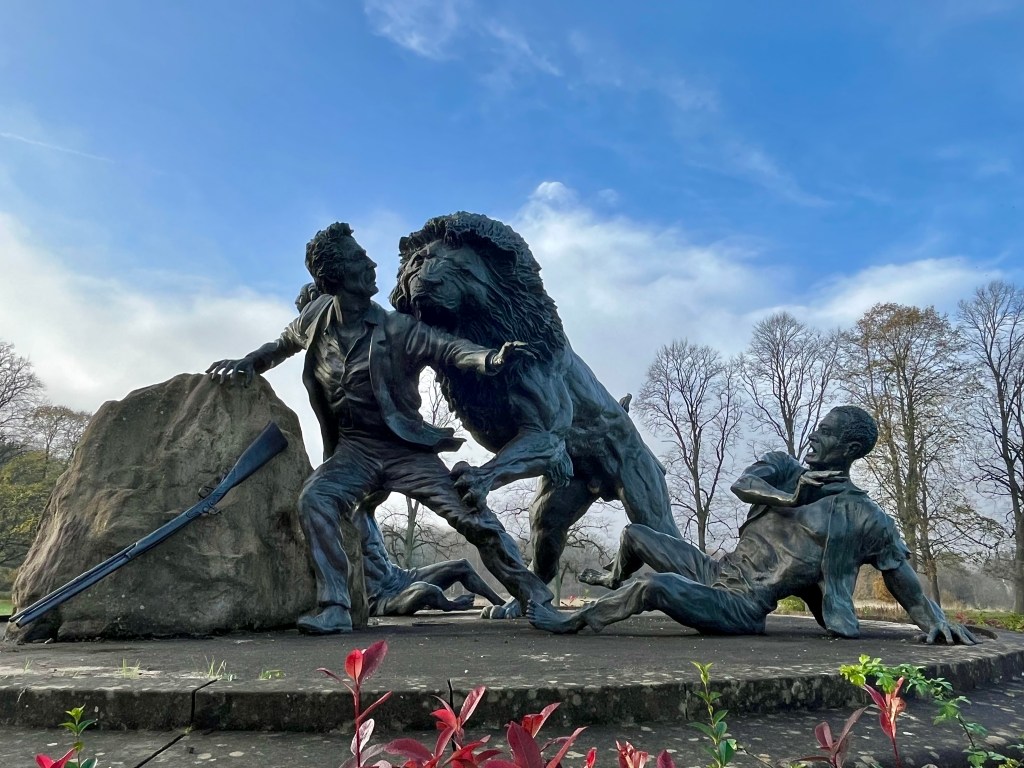 A view of the expansive siteThe old mill house cottegrs and MuseumThe African fountain with shop and restaurant in the backgroundThe large sculpture depicting the incident when they were attacked by a lion