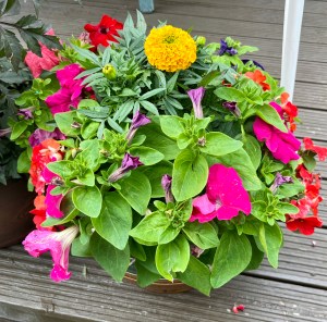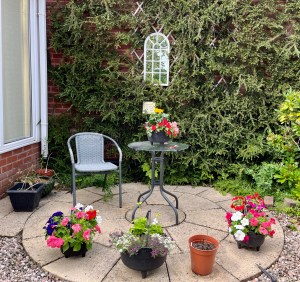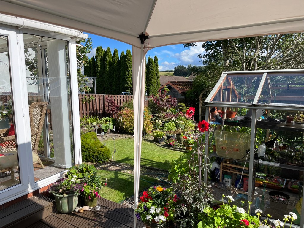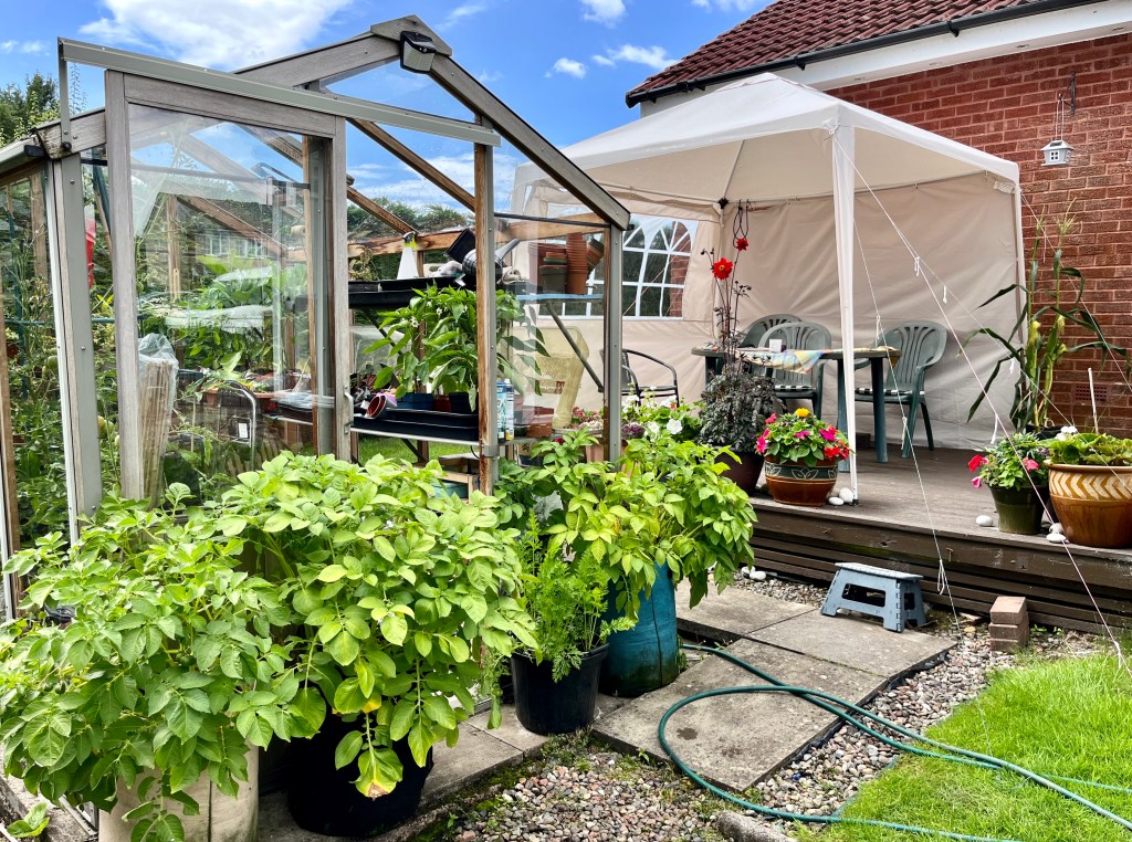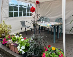 Most of the pots are filled with flowers bought as plug plants. I confess to using some of the supermarkets as their prices are usually much cheaper, and I can bring the plants on in the greenhouse. I do have a ‘Club’ card at one of the big garden centres and that too is helpful, as you get two free hot drinks of your choice when you visit! 🙂 We have had our gazeebo up since the end of May and so far it has survived even in some rather blowy days with the help of some extra ‘guy ropes’.