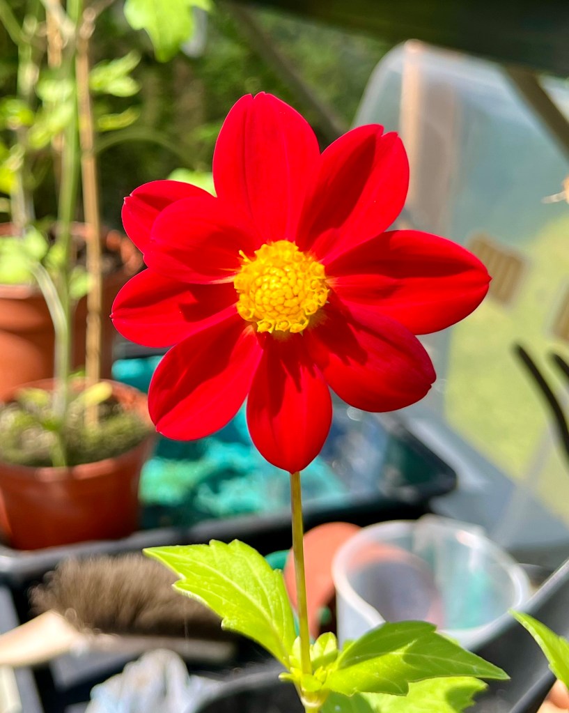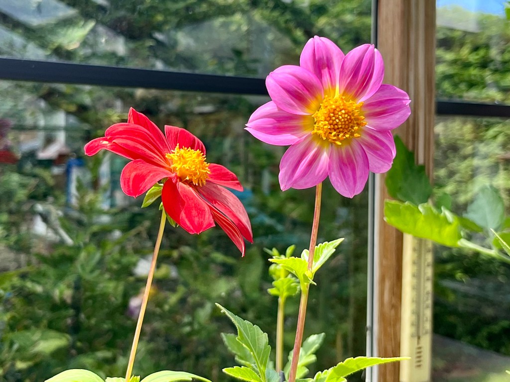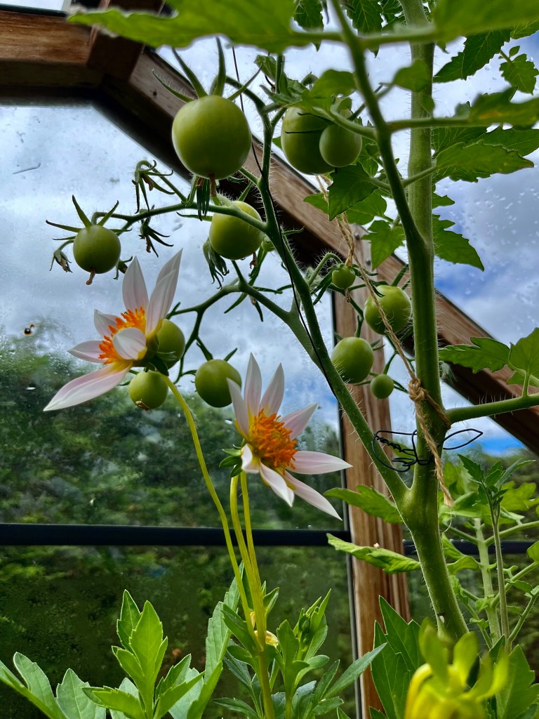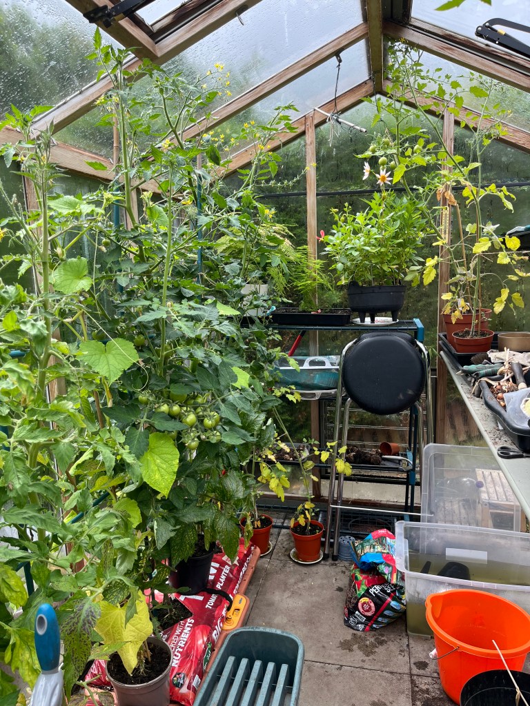 The greenhouse played its part in ‘growing on’ the Dahlia seed, but in other respects is not doing too well. I dont think the tomatoes like playing second fiddle to the Dahlias! Here’s a few pics.