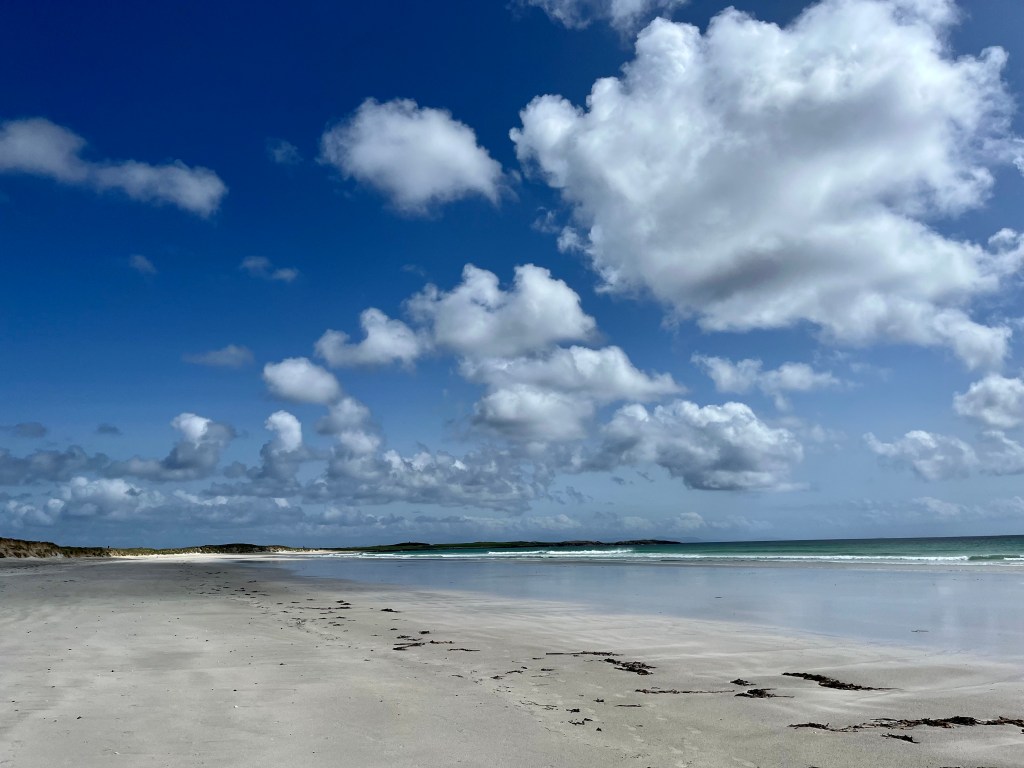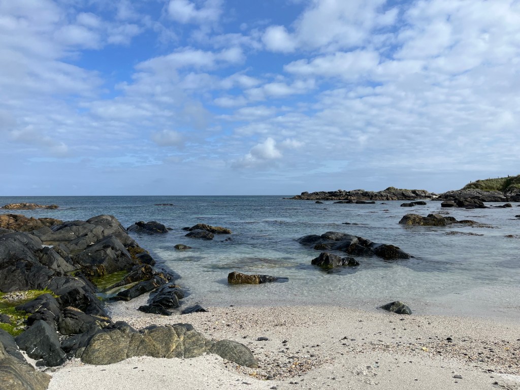 The above are not great photos, in the first two the boat was moving and I was ‘happed up’ with a life jacket. On this cool sunny day without a breath of wind, sailing off the coast of Tiree I felt it was one of these ‘time stands still’ moments when you feel over awed by the breath-taking beauty of it all! Since then, when I look at this photo I think of a similar moment on a boat on the sea of Galilee, just after dawn, when the boatman cut the engine and we floated in quietness on the still blue sea, when the sky and sea seemed to merge. Not surprisingly thoughts of the man who walked on these waters came to mind, and a chorus we sang as kids. Yea, beautiful. I know many of you will have had similar moments when confronted by the beauty of God’s creation.