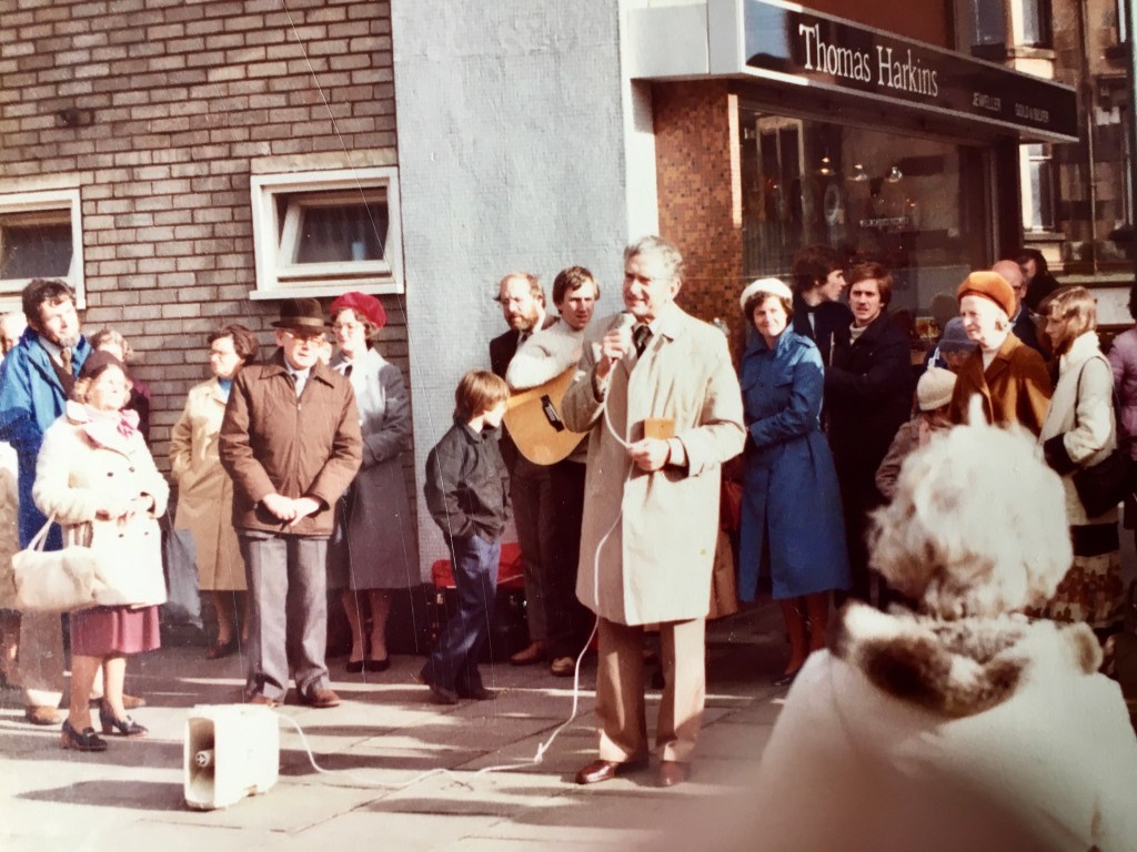 Evangelist Peter Brandon preaching at Shawlands Arcade during a Gospel CampaignEaster Serrvice in Pollok ParkEarly morning invitations to workers at the gates of ‘Donaldson and Filer’ ‘to hear Evangelist Stan FordGreenview Choirs join the mass choir at the Billy Graham Crusade 1955Wolesley Gospel HallThe Old Mearns Gospel HallElim Evangelical Church – Crosshill