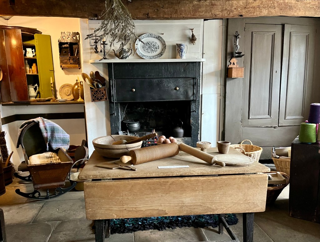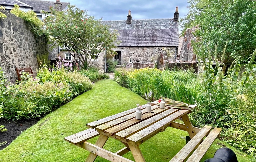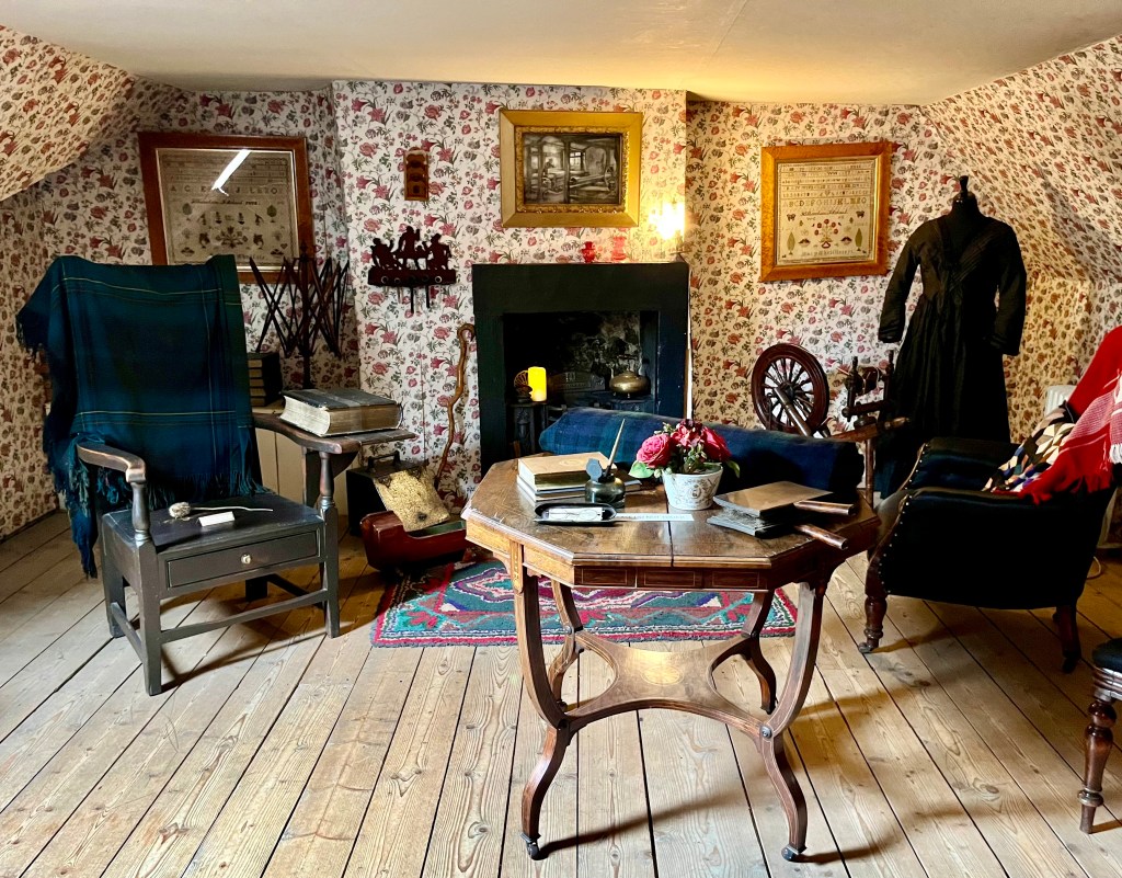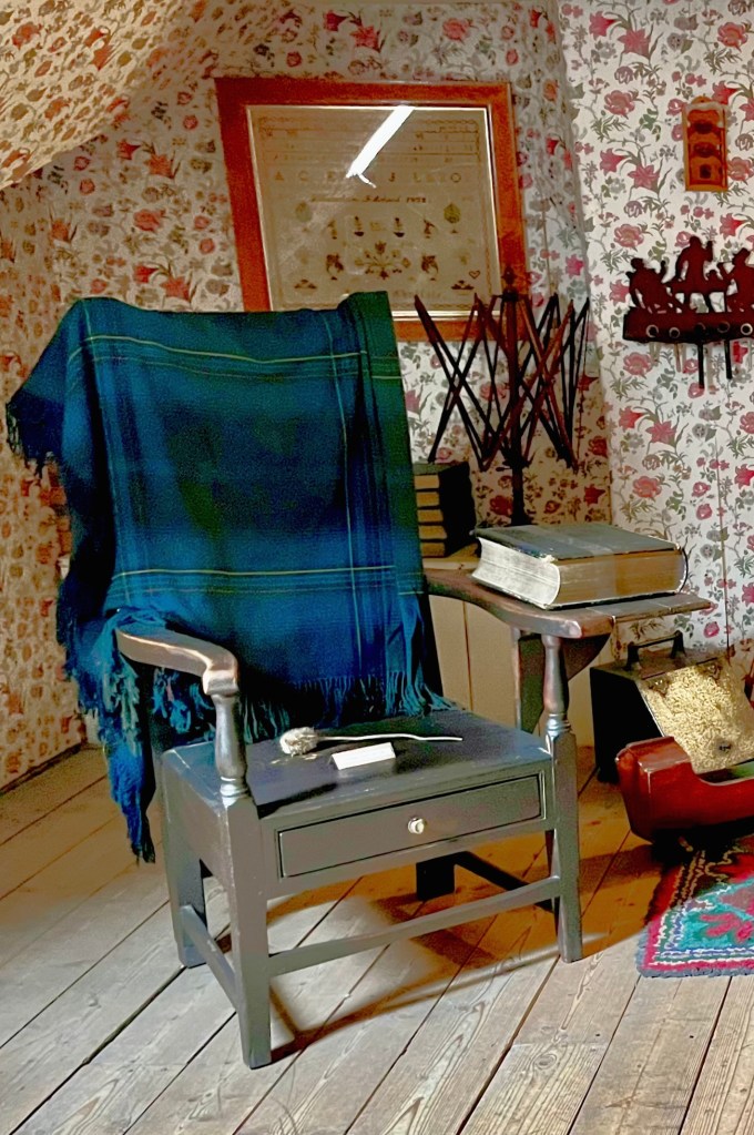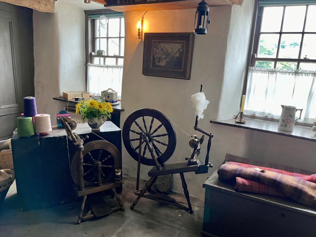 The kitchenSpinning WheelThe ‘inset’ bedAnother ‘inset’ bedthe Loomanother sty;e of loomThe Bible Chair – Bible dated from18th CenturyThe Bible Text above the bedGrinding wheelsBeautiful gardenThe Living RoomA loom typical of those used in the West of Scotland in the eighteenth century