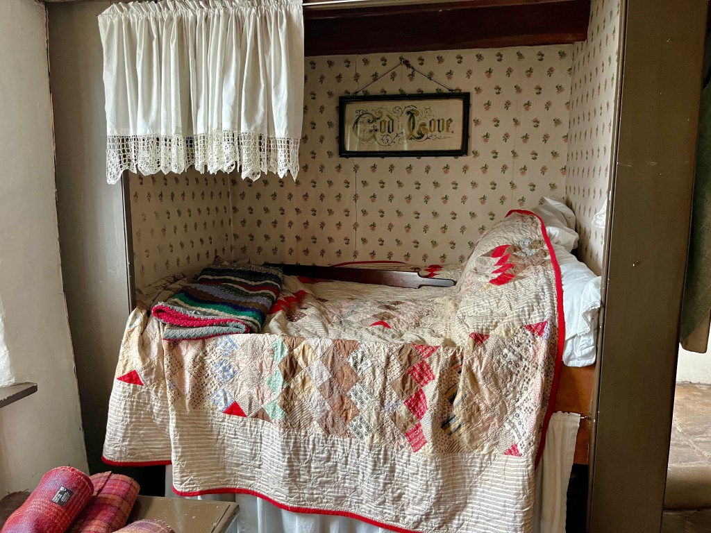 One thing about the Weaver’s Cottage that grabbed our attention was the number of rooms with an ‘inset’ bed. The beds were so short that it would have been impossible for an average adult to lie out on them. This we were told was no problem as the people of the day preferred to sleep in a sitting position! That was the first time I had heard of such a thing.