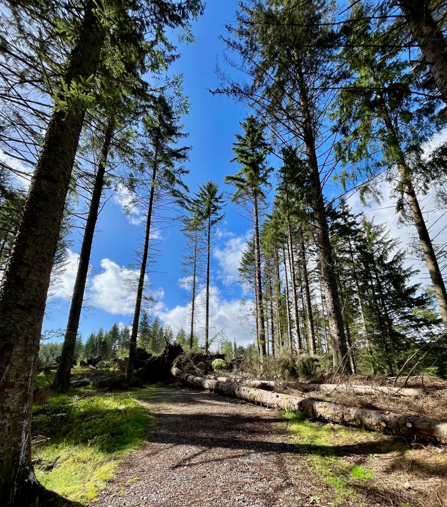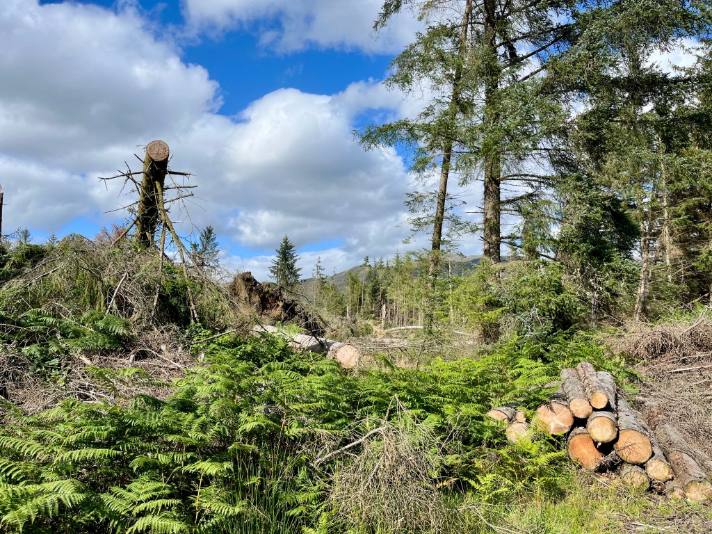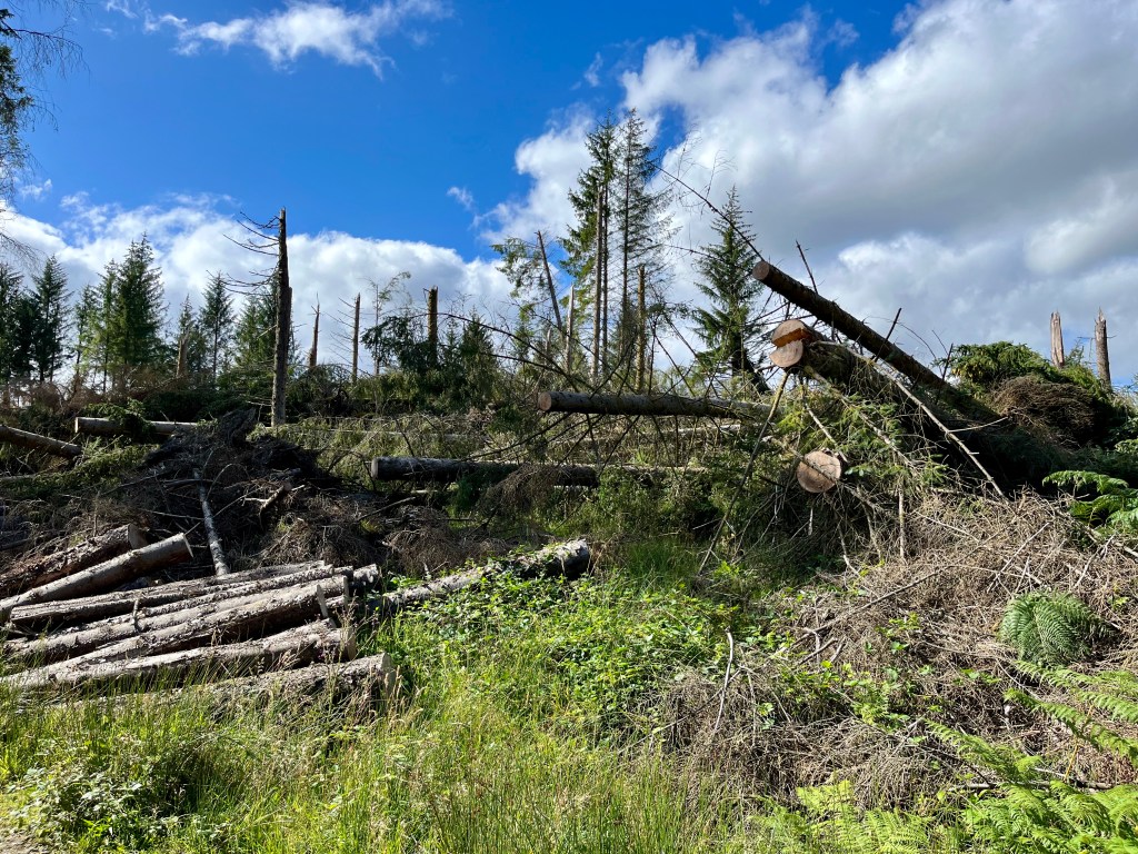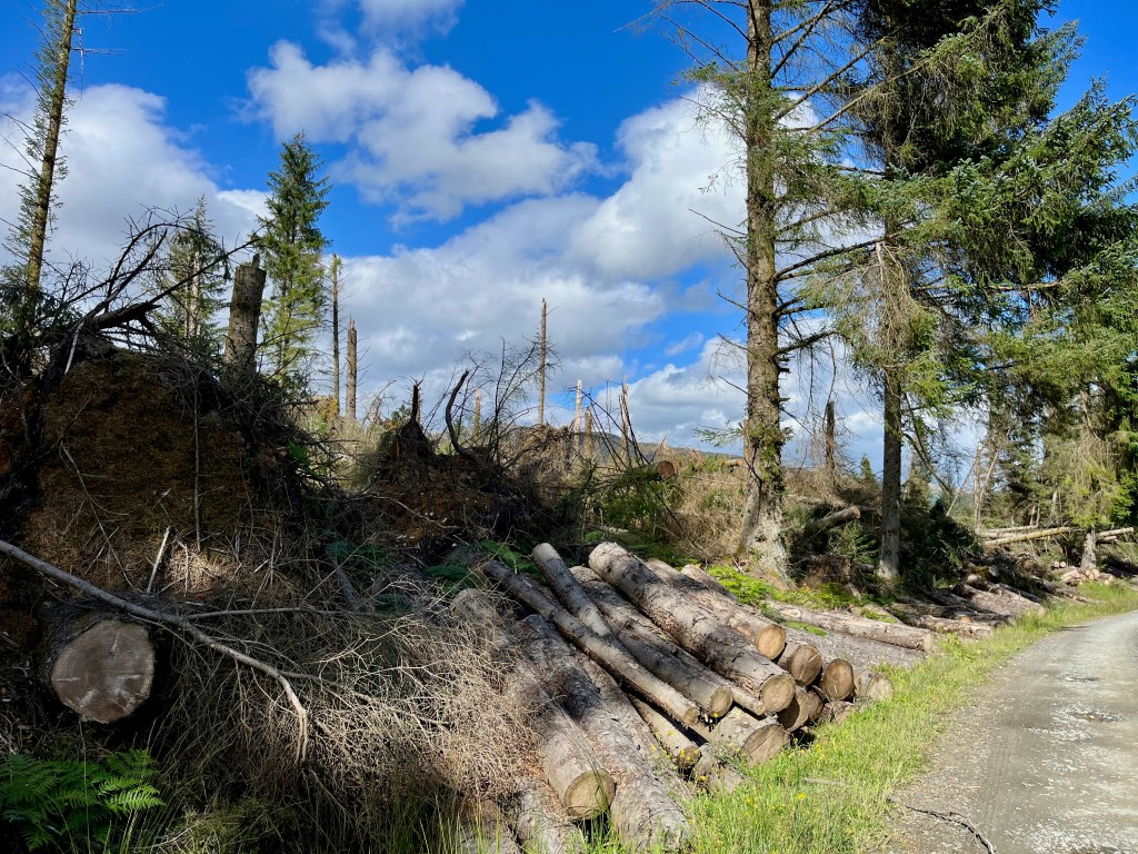 At the end of November last year (26th-27th), ‘Storm Arwen’ swept across Scotland and parts of the UK with gusts reaching up to 100mph. It was headline news at the time, three people were reported killed, 9000 were left without power, roads were blocked and property damaged. However if you are like me you will probably have long forgotten all about it by now. However a few weeks ago we made our annual trip to the Trossachs for our drive around the ‘Three Lochs Forest Drive’ on the dirt road that passes loch Reoidhte, Drunkie and Achray, then that old news came alive again!
